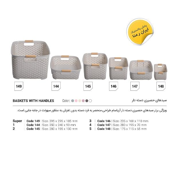 سبد دسته دار دارای پنج سایز مختلف می باشد و این سبد از نظر ظاهر بسیار زیبا و ساده می باشد .