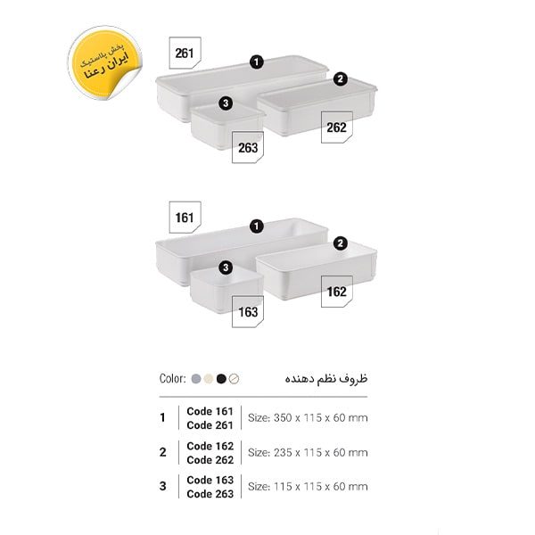 ظرف نظم دهنده دربدار در سه سایز مختلف تولید میشود و از نظر ظاهر بسیار زیبا و ساده می باشد.
