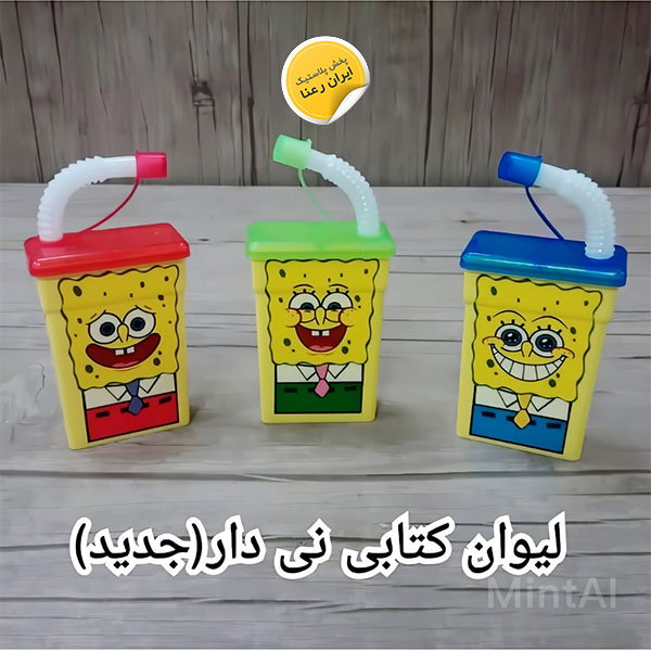 لیوان کتابی نی دار دارای رنگ بندی الوان می باشد بدنه این لیوان به شکل باب اسفنجی به رنگ زرد ثابت است .