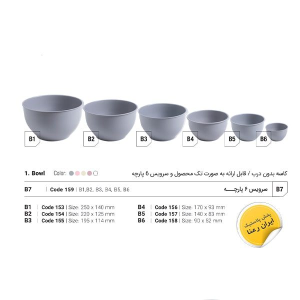 کاسه B در شش سایز مختلف تولید میشود و رنگ بندی این محصول بسیار بالا می باشد.
