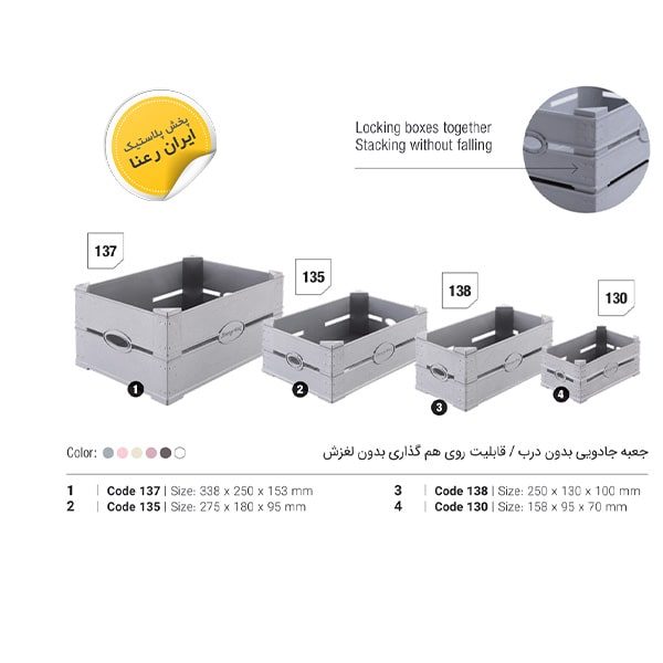 جعبه جادوئی در چهار سایز مختلف تولید میشود و از نظر رنگ بندی الوان و متنوع می باشد.