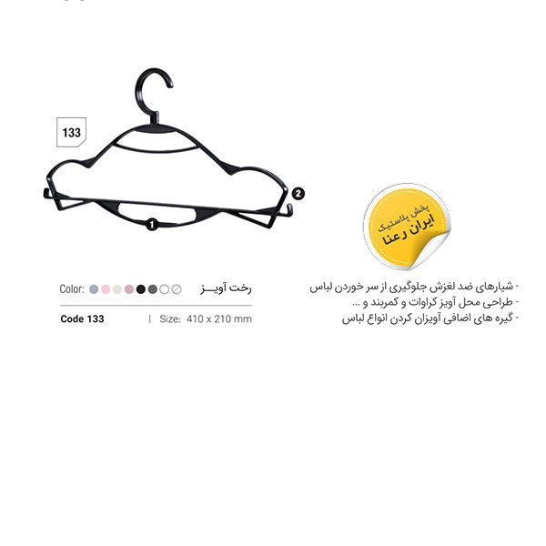 این محصول دارای رنگ بندی الوان و متنوع ایی دارد و در یک کارتن ان 12 ست رخت آویز آریسام قرار میگیرد .