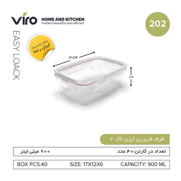در یک کارتن این محصول 40 عدد ظرف ویرو ایزی لاک مستطیل 202 قرار میگیرد.