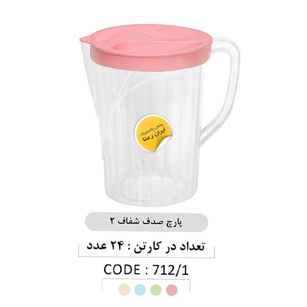 بدنه این پارچ شفاف است و درب ان رنگ بندی الوان و متنوعه ایی دارد و این پارچ صدف دارای دسته می باشد .